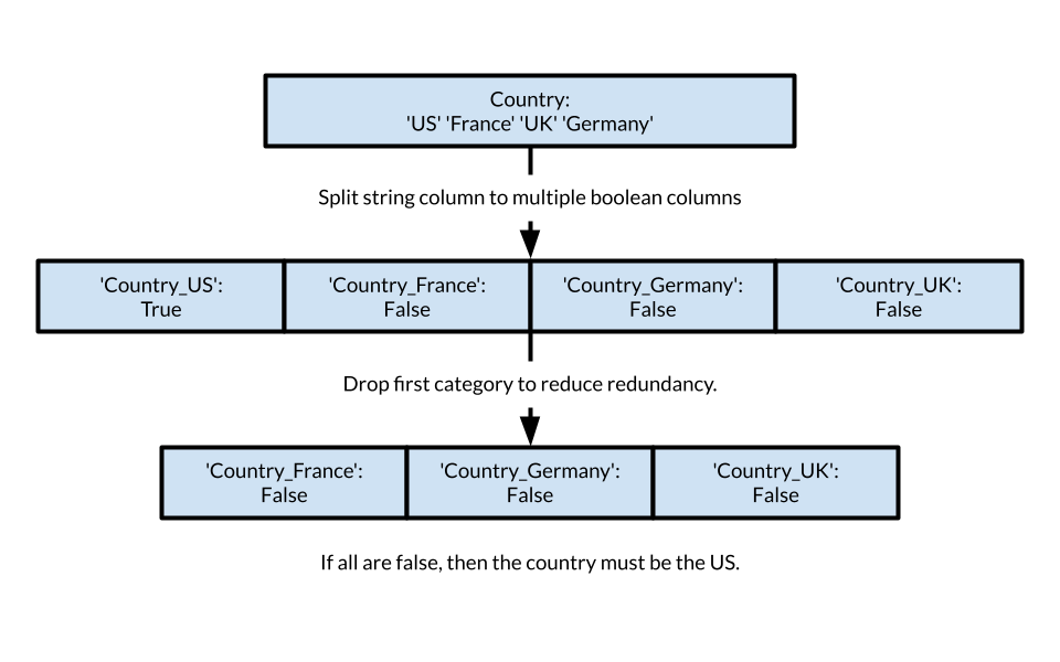 The model of course doesn't understand words/strings, so we must encode them into numbers. Each categorical column is replaced by multiple new boolean cols, one per category (dummy variables). If the string column has 4 categories, it will be split into 4 new columns of each country. Then, one is dropped to avoid the dummy variable trap, which is when one of the columns can be derived from the others, and thus is redundant.